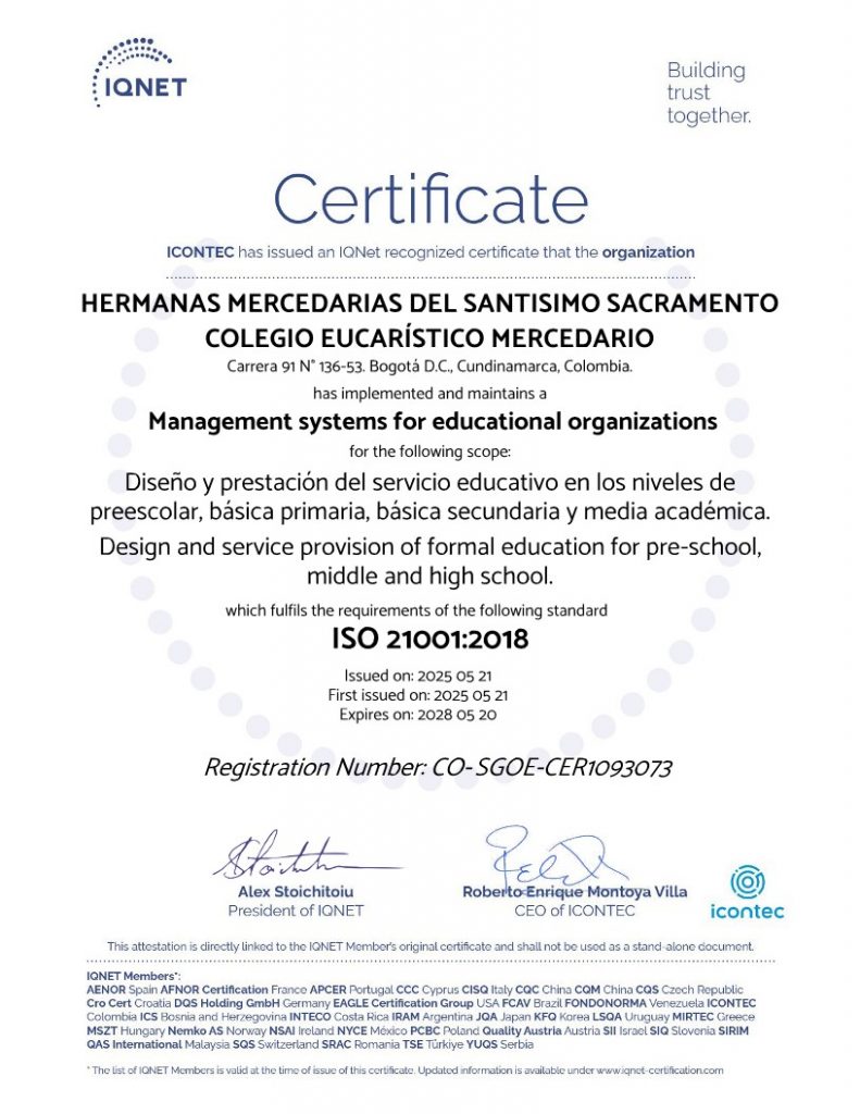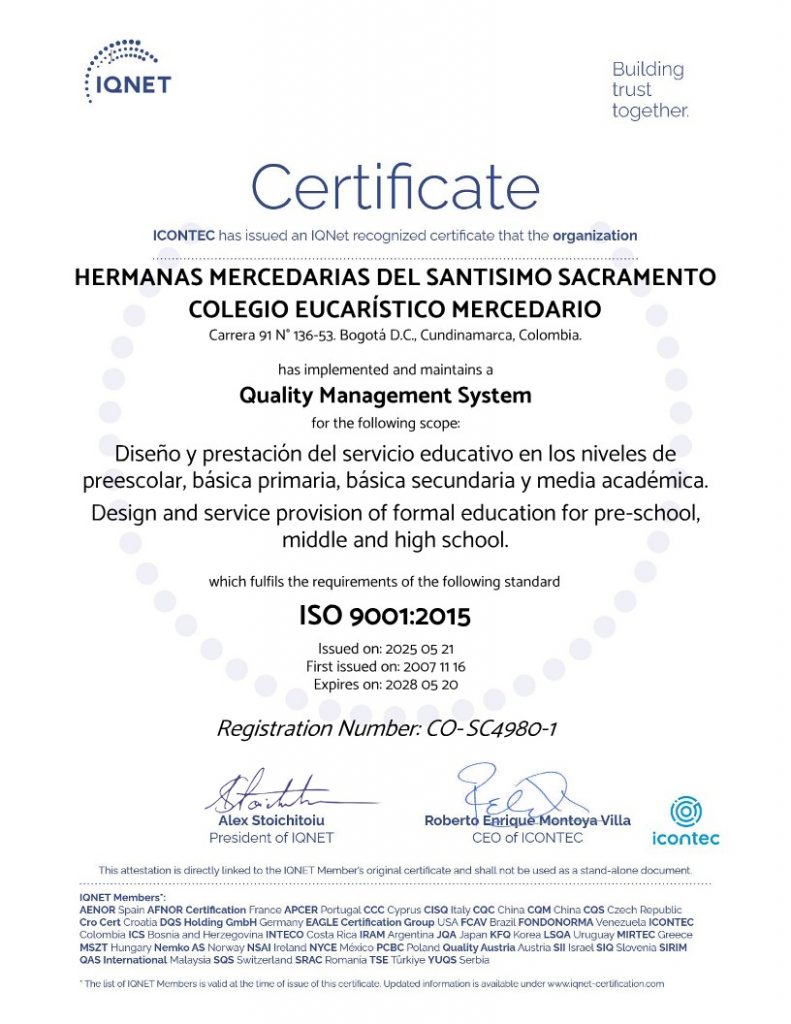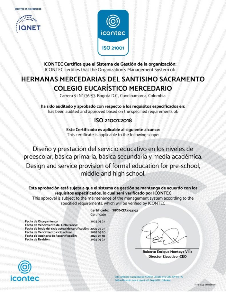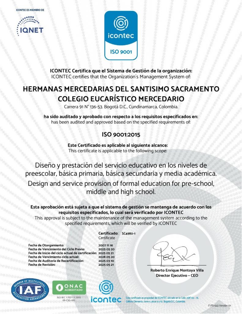 Contamos con un recurso Humano Calificado en continua formación y comprometido con el Proyecto Educativo Institucional que trabaja en equipo, empleando nuevas tecnologías de la formación y comunicación con unidad de criterios en los lineamientos Pedagógicos Institucionales y el carisma Eucarístico Mercedario, fundamentados en la legislación Educativa Vigente dentro de un Sistema de Gestión de Calidad con mejora continua de los procesos para lograr la satisfacción de nuestros clientes.